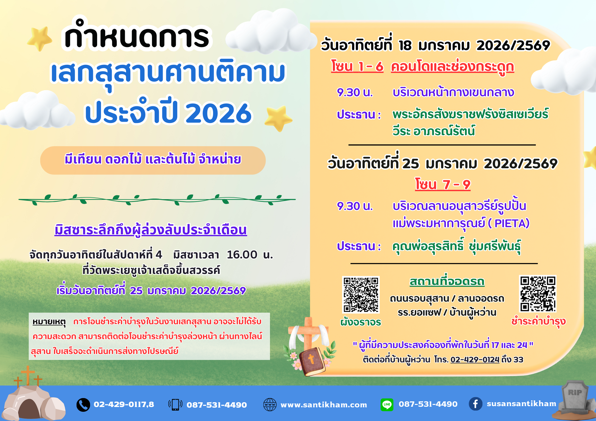 หน้าแรก | ประวัติสุสาน | ประวัติวัด | ค้นหาหลุมศพ | ตารางมิสซาประจำเดือน | ตารางมิสซา | ข่าวสาร | รวมรูปภาพ | ติดต่อเรา บทสวดพลมารี